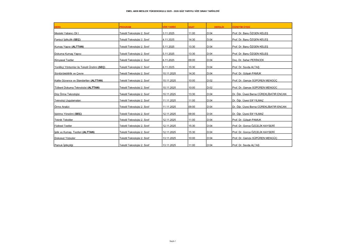 2025-2026 Güz Yarıyılı Vize Sınav Tarihleri